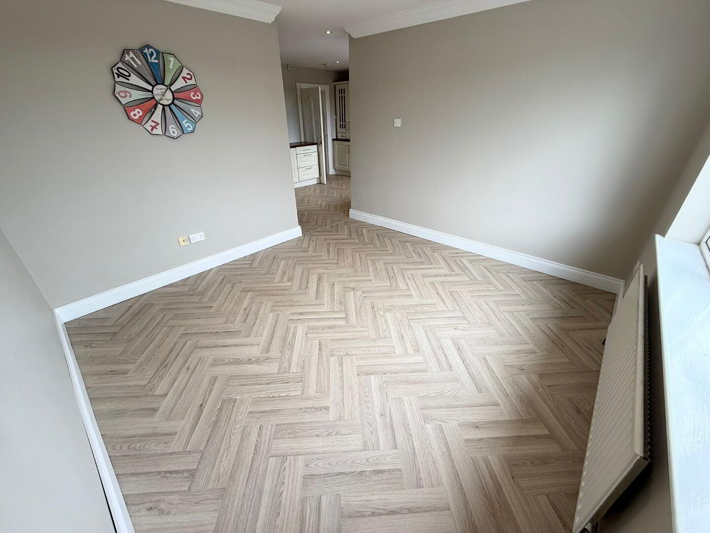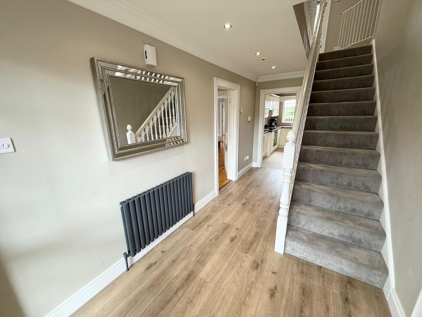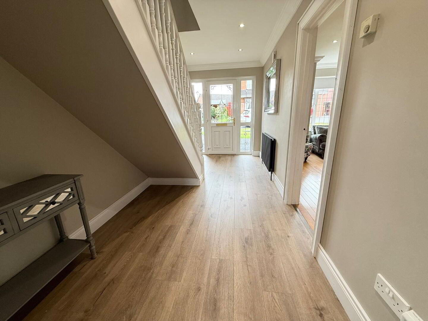 Spacious and welcoming entrance hall laid in stylish wood-effect flooring, enhanced with ceiling spotlights and elegant ceiling coving for a refined finish.