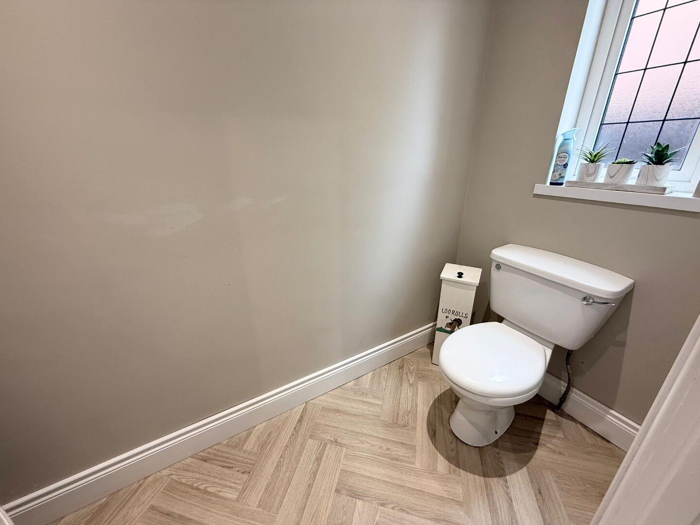 Ground floor guest WC located off the utility room, fitted with a modern 2-piece suite comprising WC and wash hand basin. Includes ceiling spotlights and ceiling coving.