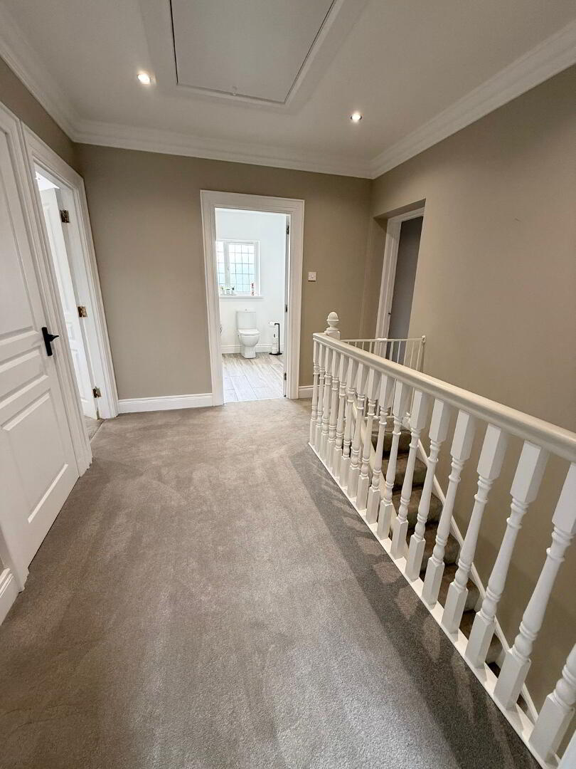 Spacious landing area providing access to all first-floor rooms, finished with ceiling spotlights and ceiling coving for a bright and polished look.