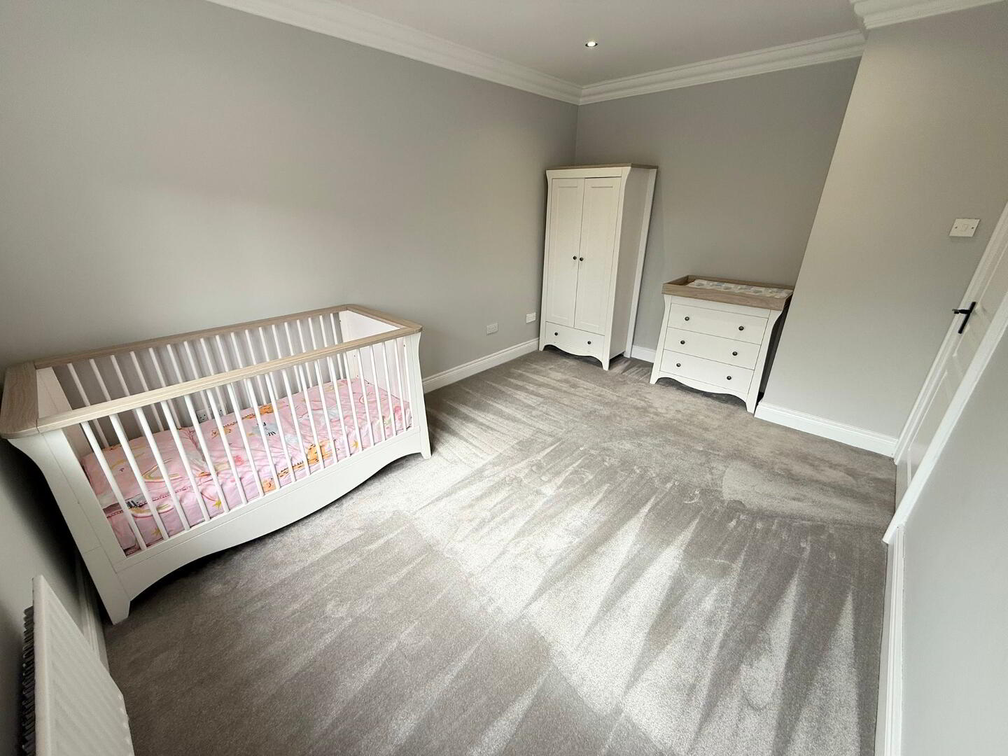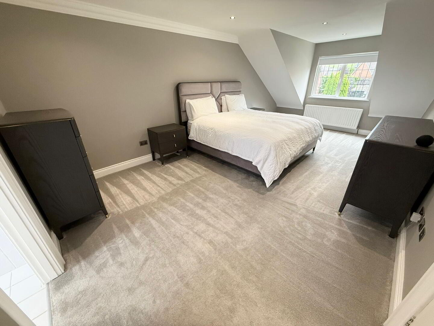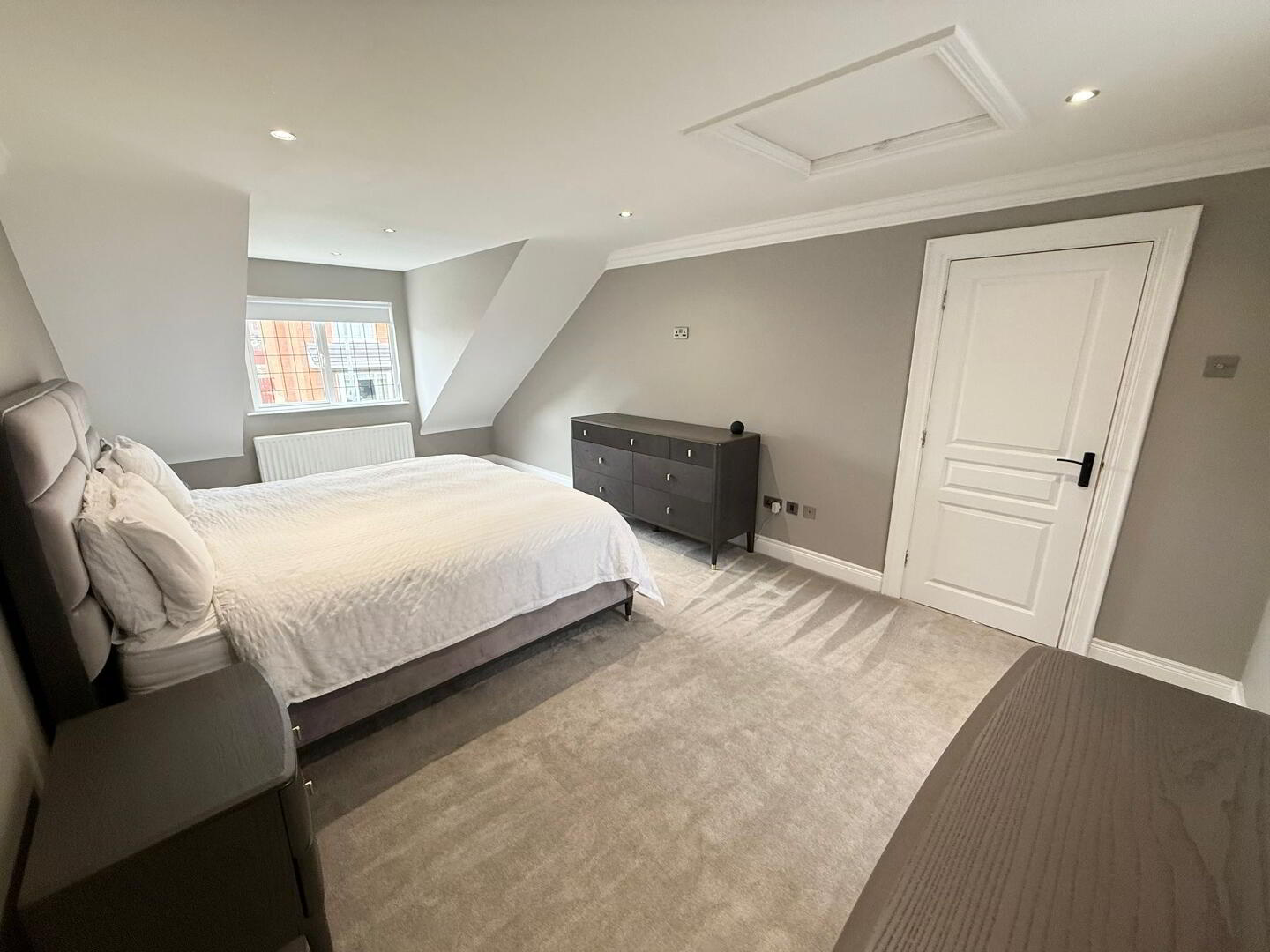Spacious double bedroom laid in soft carpet flooring, with dimmer lighting, ceiling spotlights, and decorative ceiling coving.