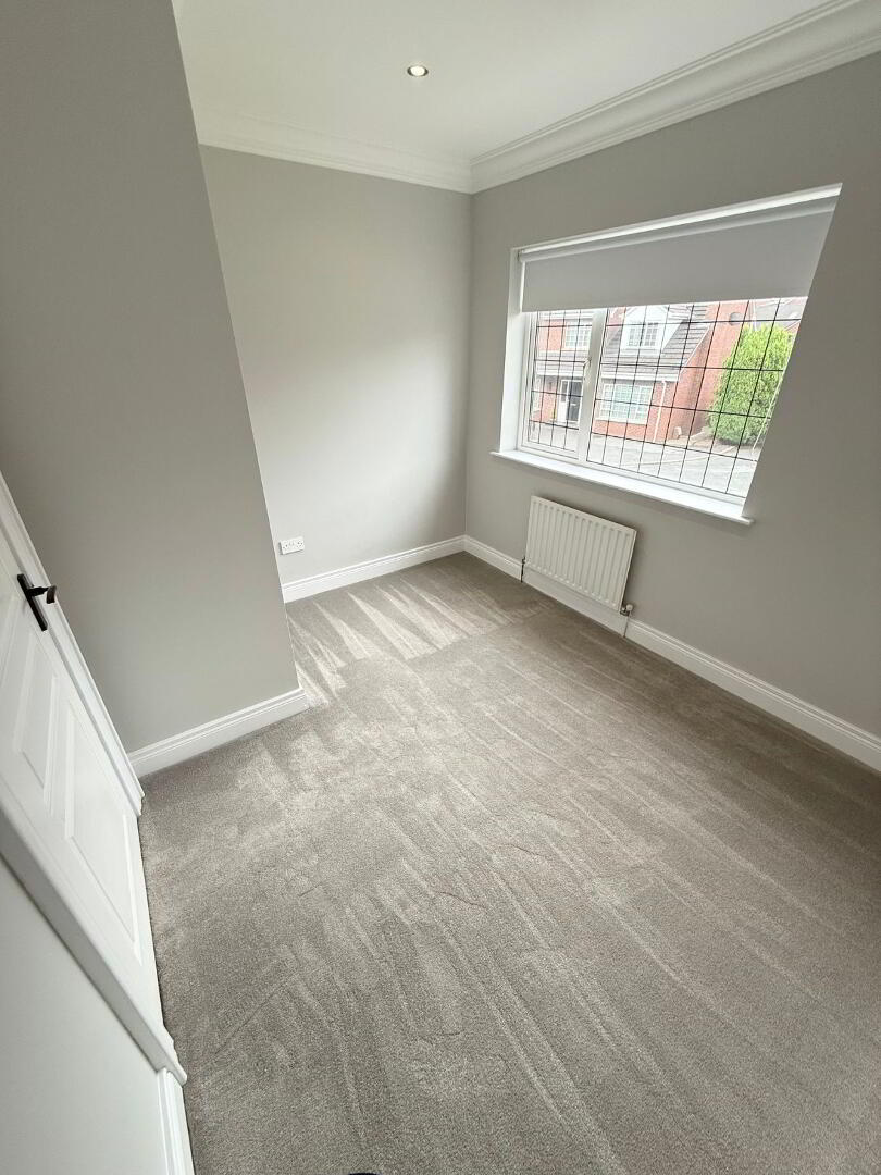 Generous front-aspect double bedroom with carpet flooring, ample wardrobe space, electrical points, ceiling spotlights, and ceiling coving.