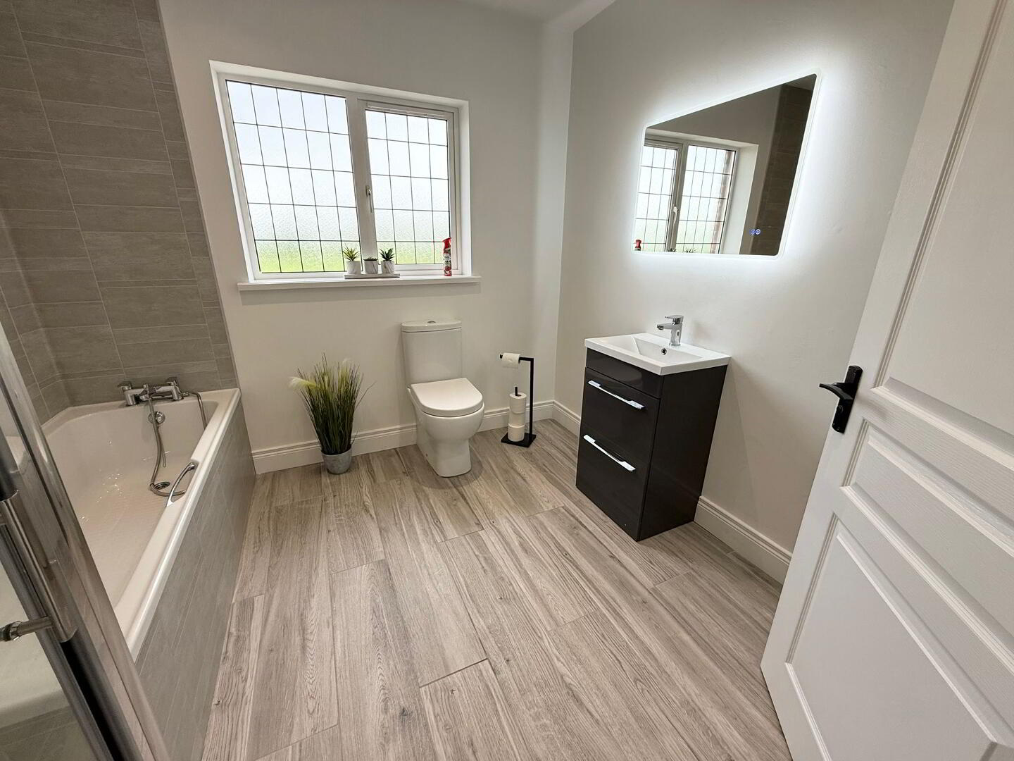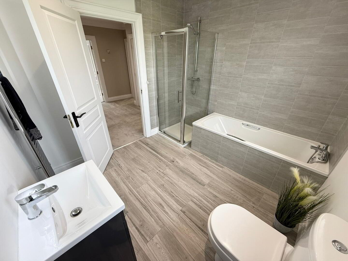 Large family bathroom featuring a 4-piece suite comprising corner walk-in shower, bathtub, WC, and wash hand basin. Finished with tiled flooring, part-tiled PVC walls, ceiling spotlights, ceiling coving, and wall-mounted towel radiator.