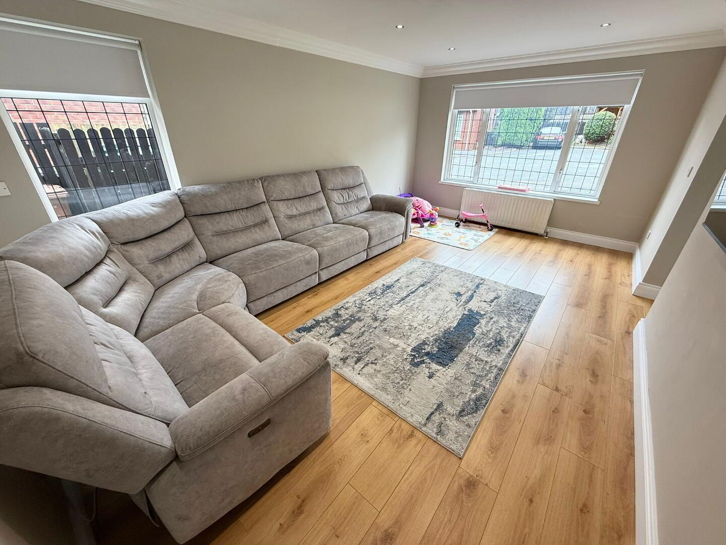 Generous family living space laid in wood-effect flooring, featuring double radiator, TV and electrical points, ceiling spotlights, and decorative ceiling coving.