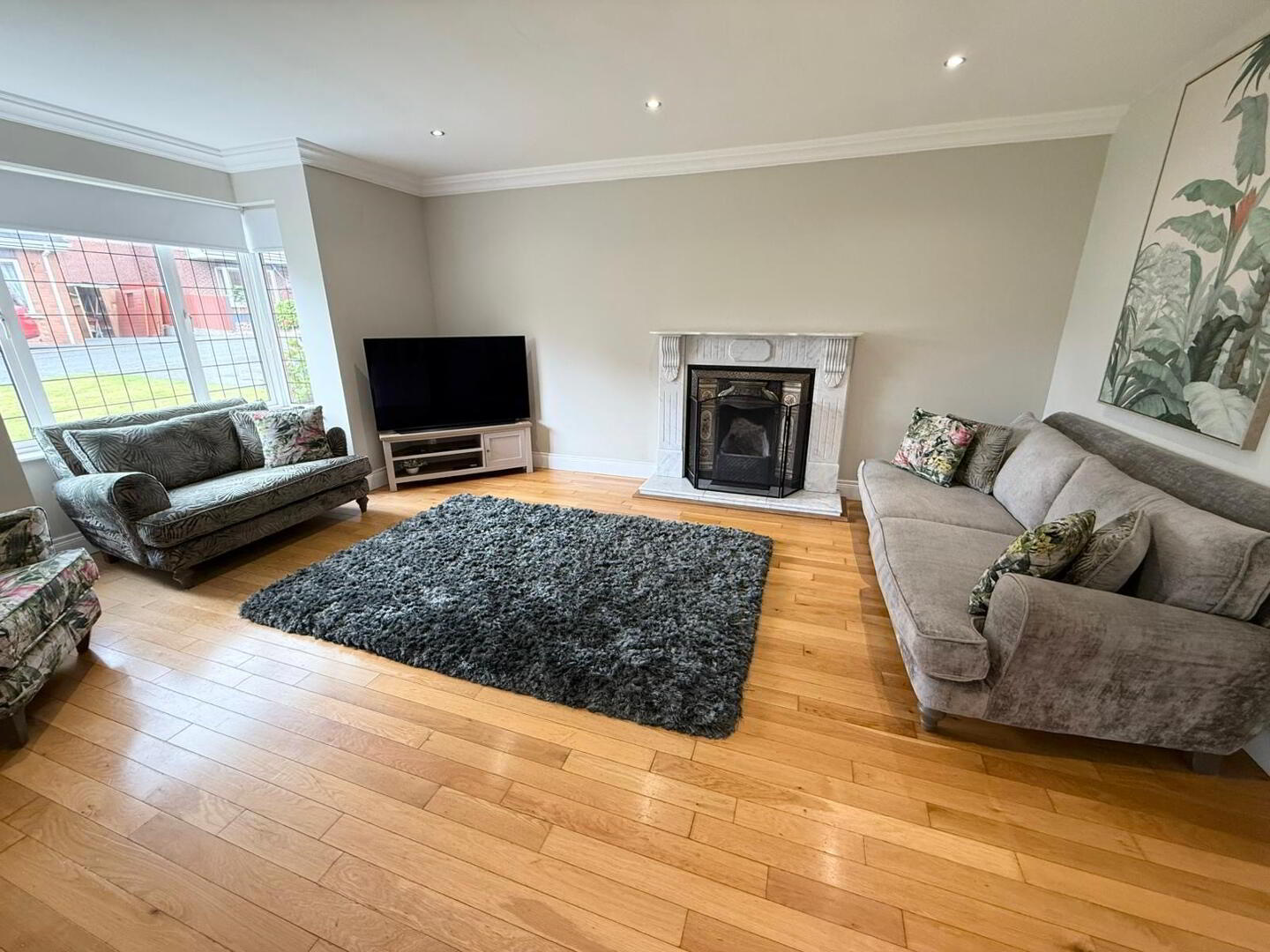 Spacious second reception or family room with a built-in fireplace and feature surround, wood-effect flooring, TV and electrical points, large bay window, and access to the ground floor en suite bedroom. Finished with ceiling spotlights and ceiling coving.