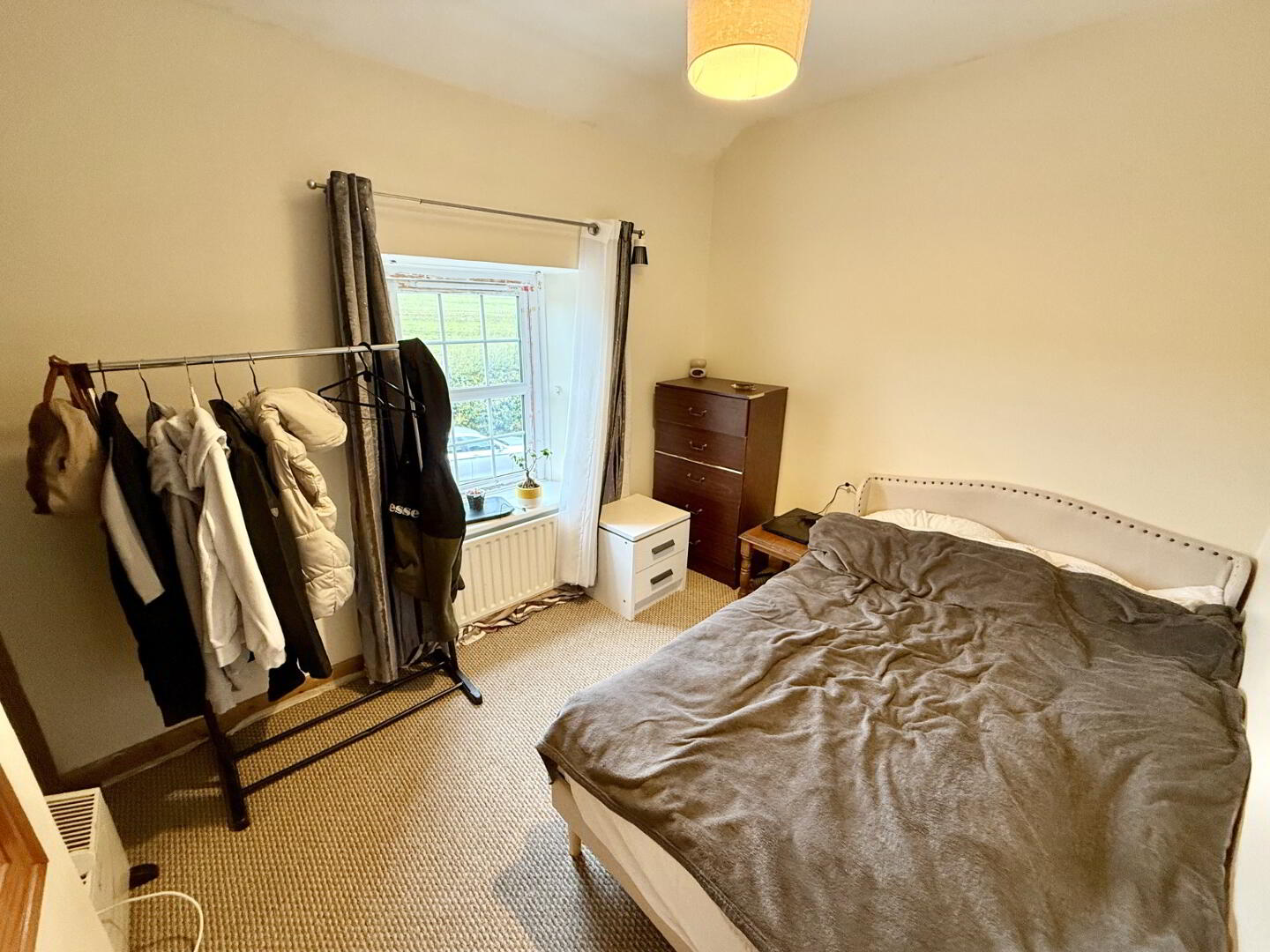 Single bedroom with carpet flooring.