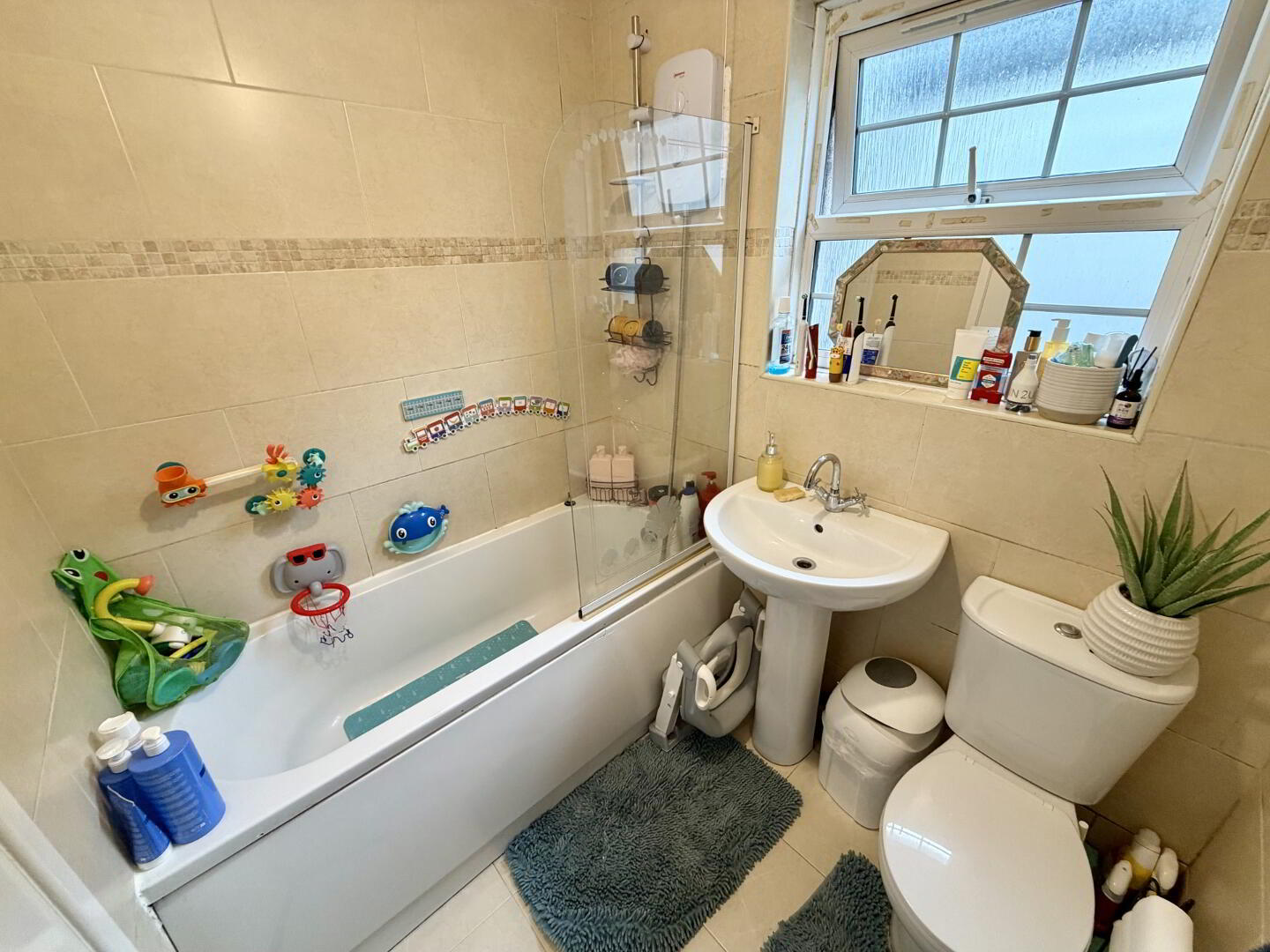 Four-piece suite comprising WC, bathtub, wash hand basin, and overhead electric shower. Fully tiled floor and walls.