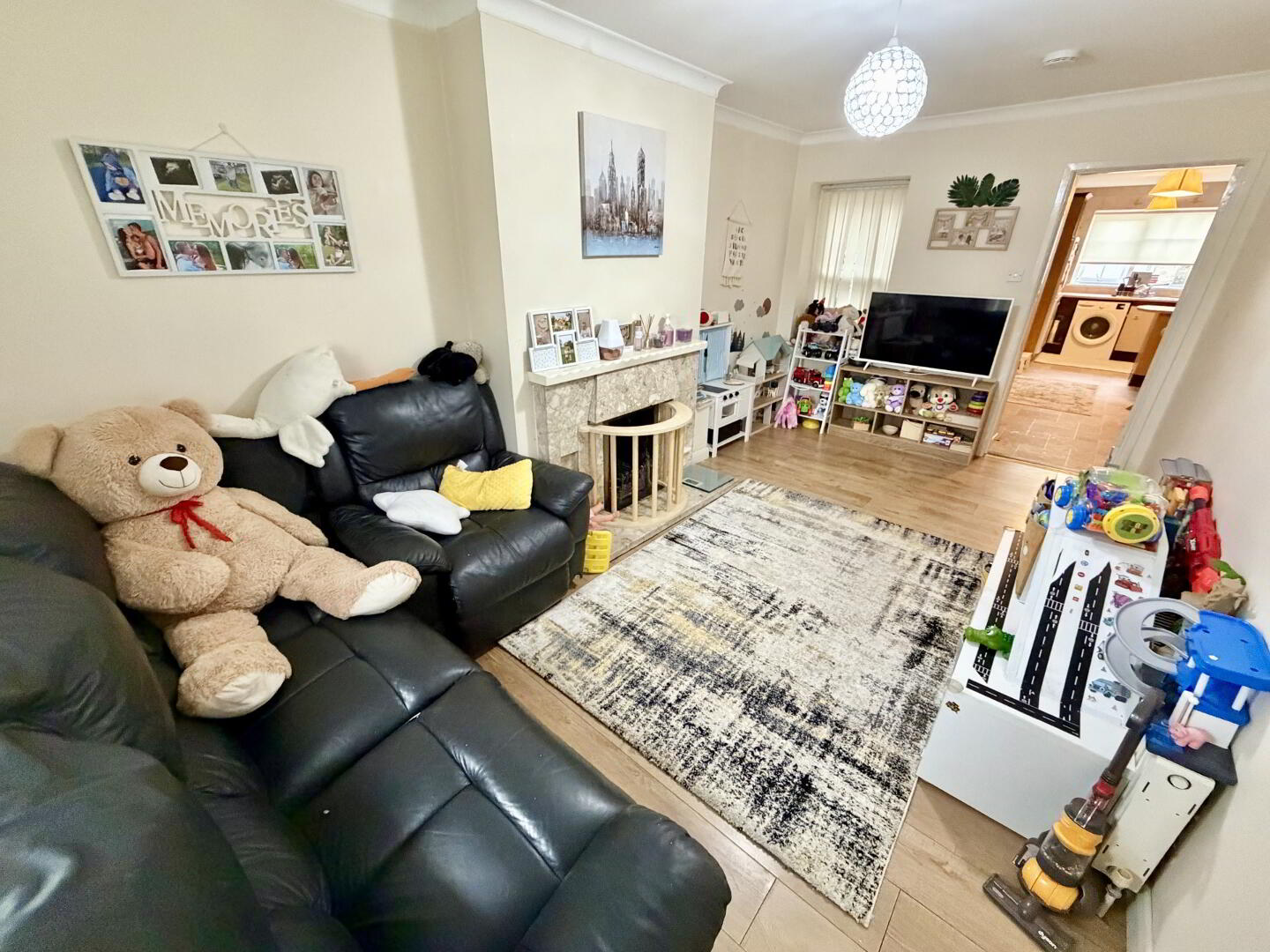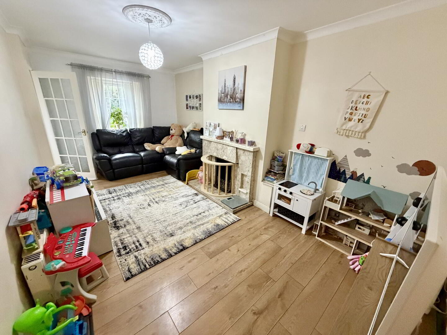 Spacious family sitting room with open fire and feature surround, finished with wood-effect flooring.