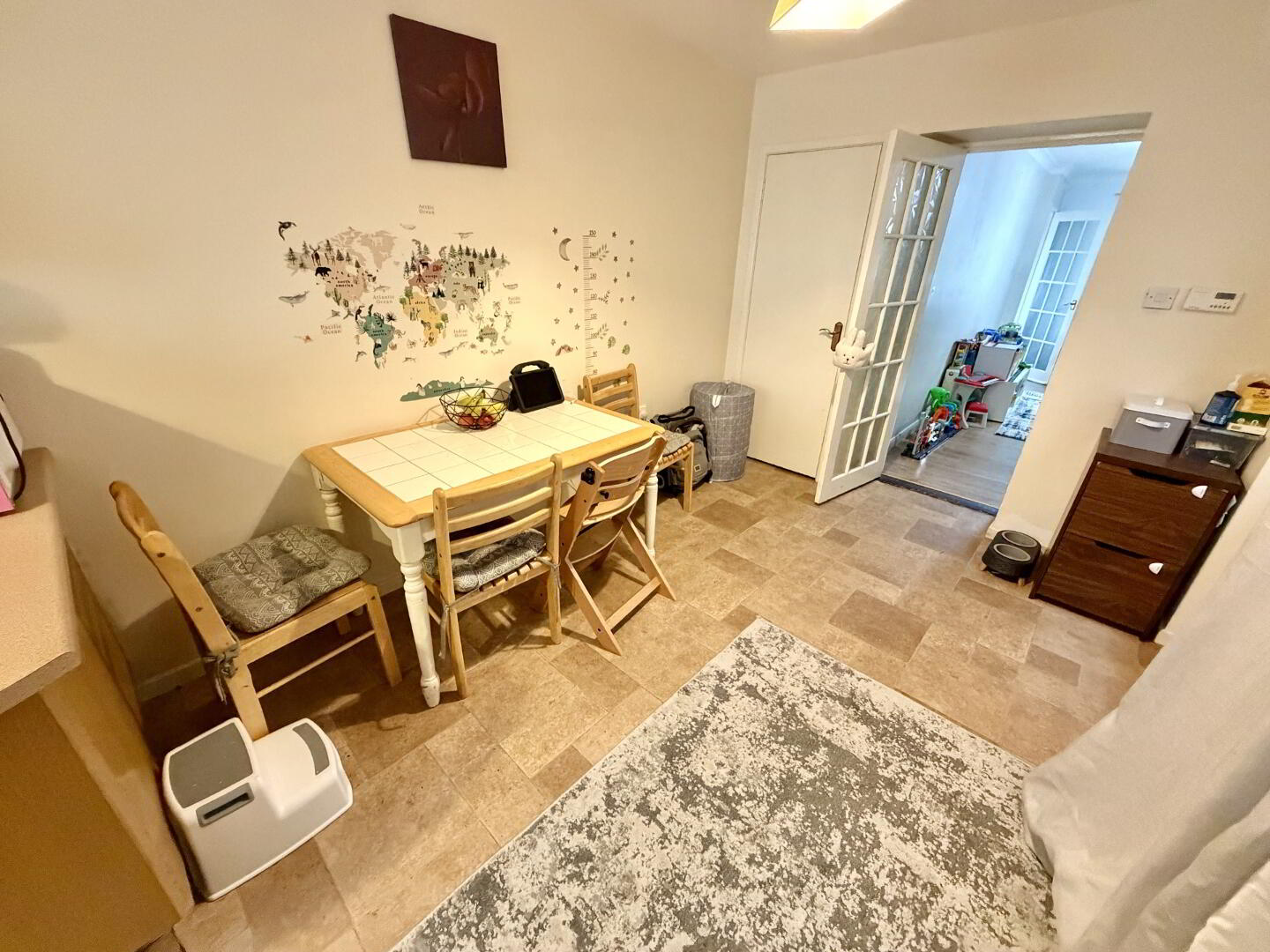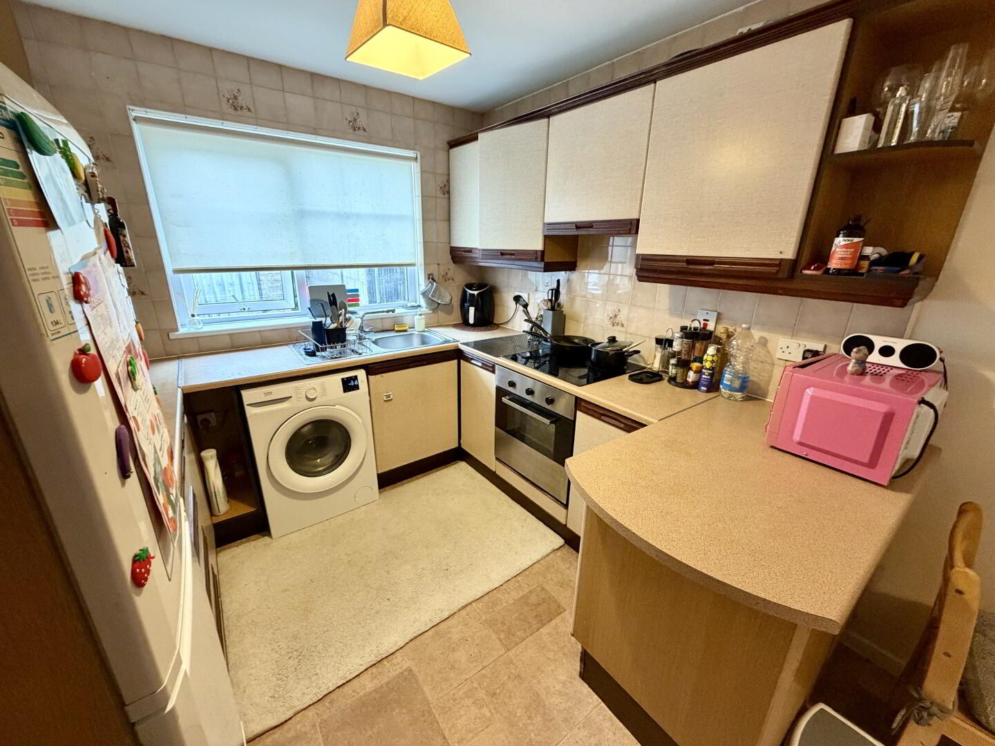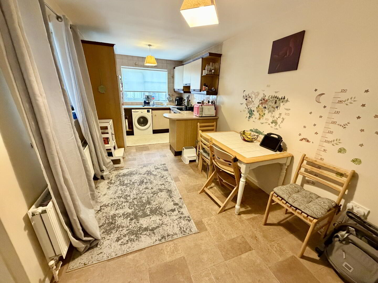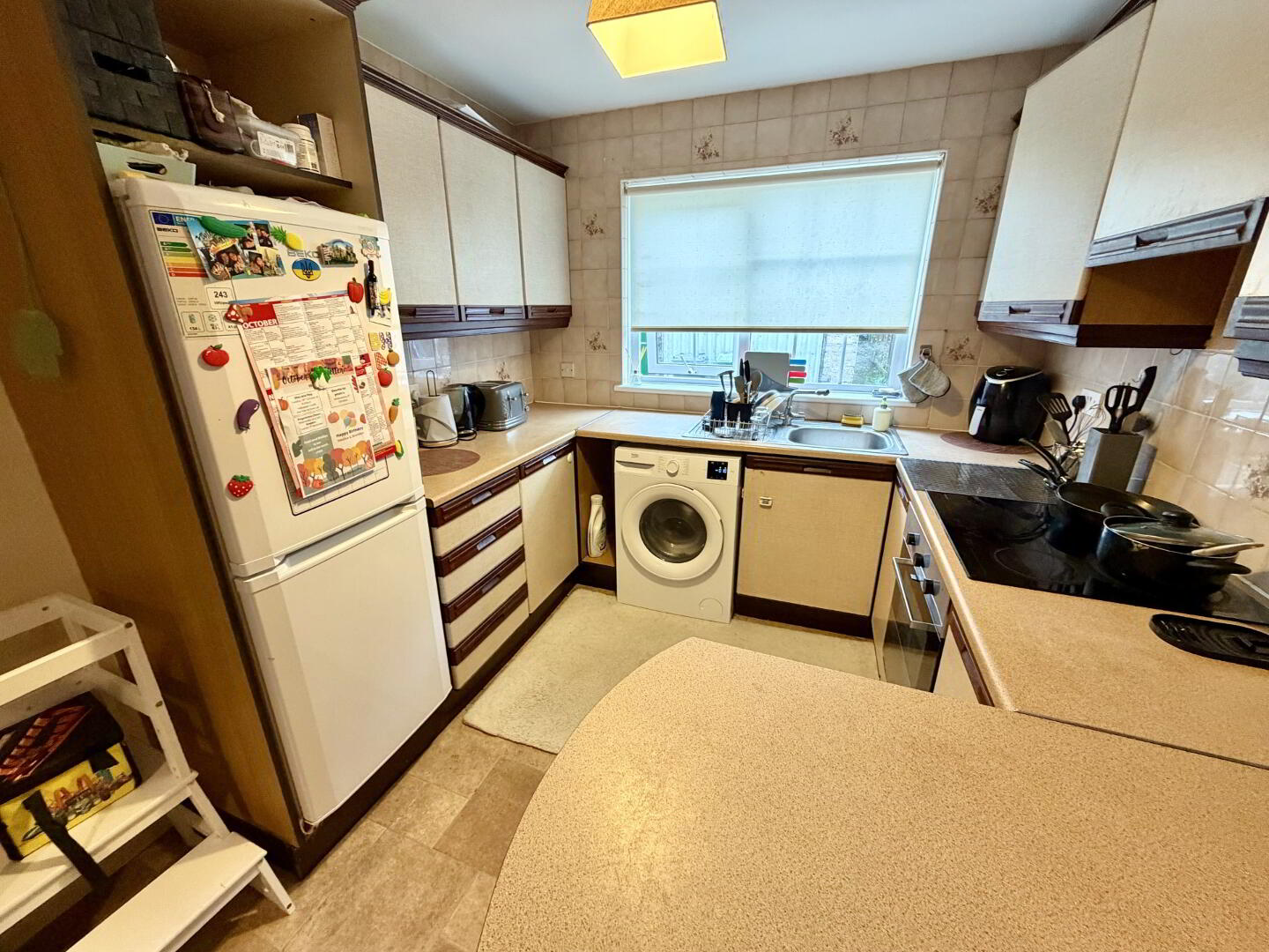 Fully fitted kitchen with open-plan dining space. Features high and low units with breakfast bar, tile-effect lino flooring.