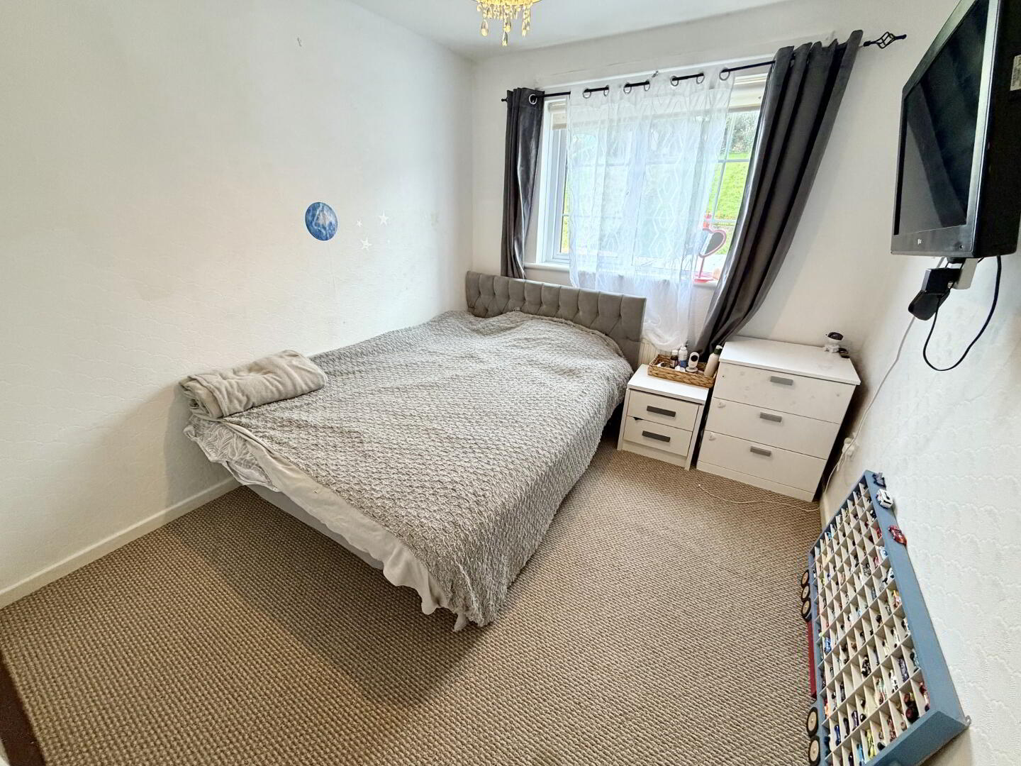 Front aspect double bedroom with built-in wardrobe and carpet flooring.