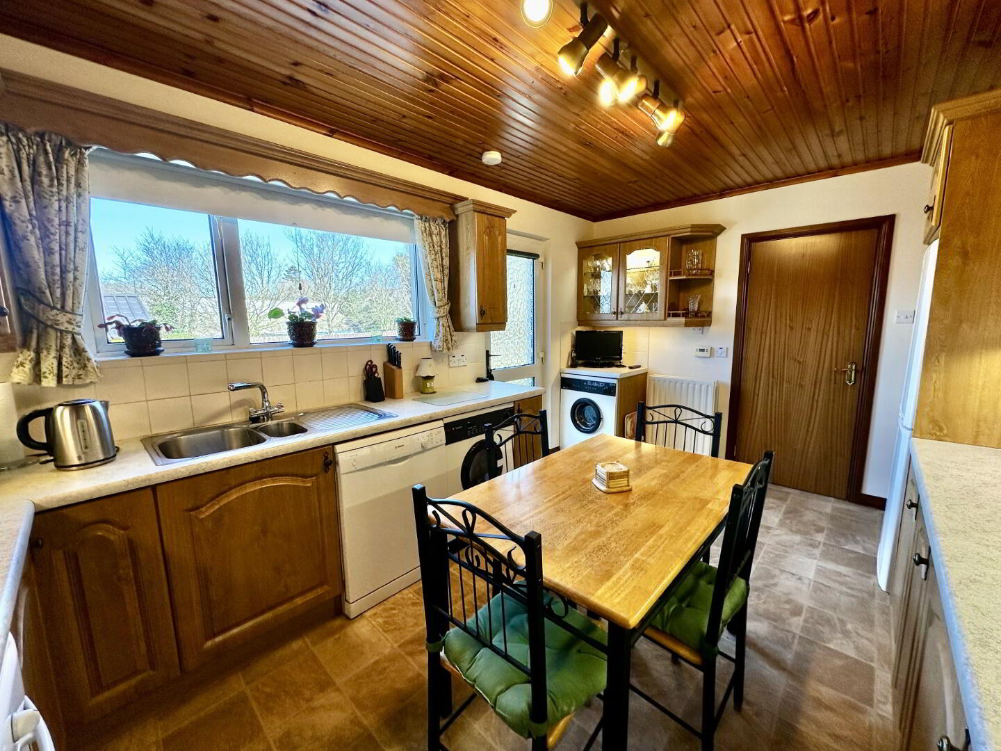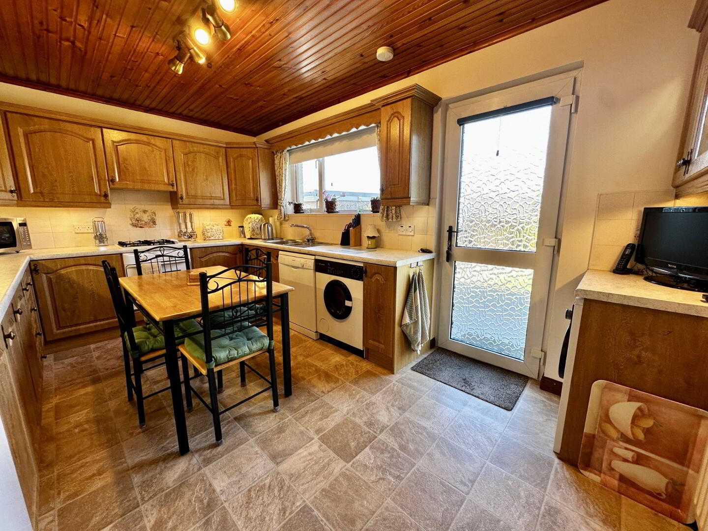 A large family kitchen, fitted with a range of high and low units. The space is plumbed for a washing machine, dishwasher, and tumble dryer, with designated areas for an integrated cooker, hob, fridge, and freezer. The flooring is finished with tile-effect lino, and downlighting under the kitchen units. A door provides direct access to the rear garden.