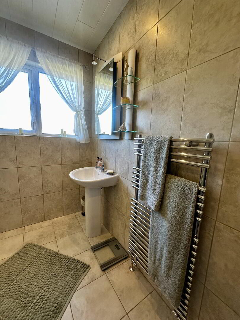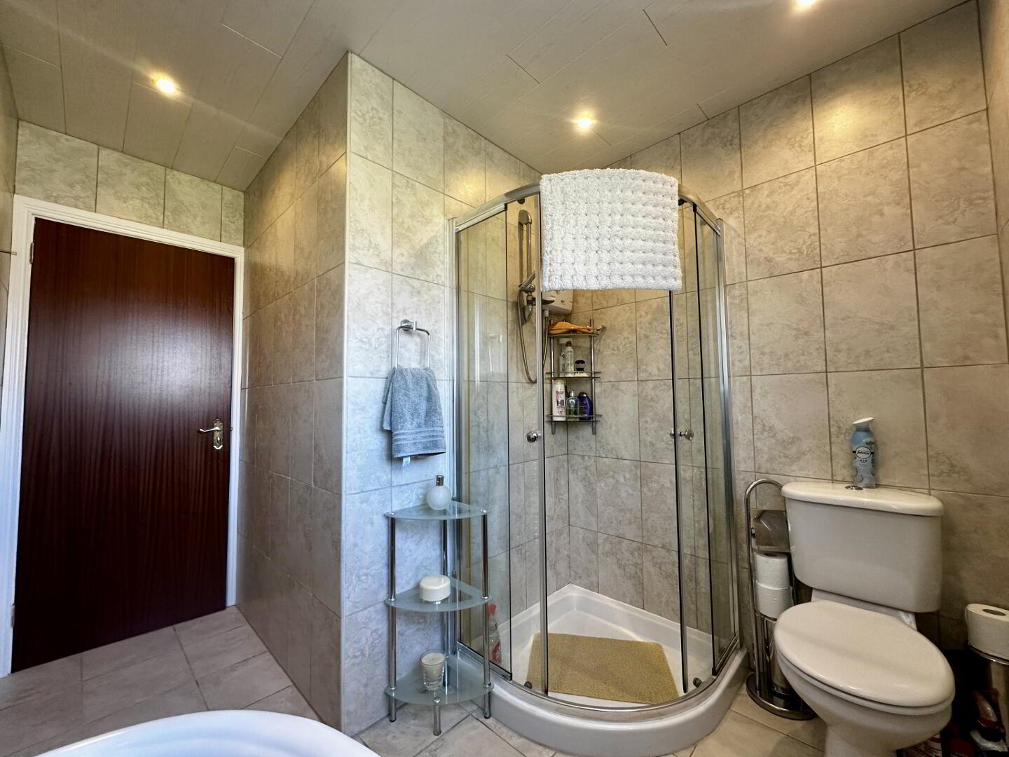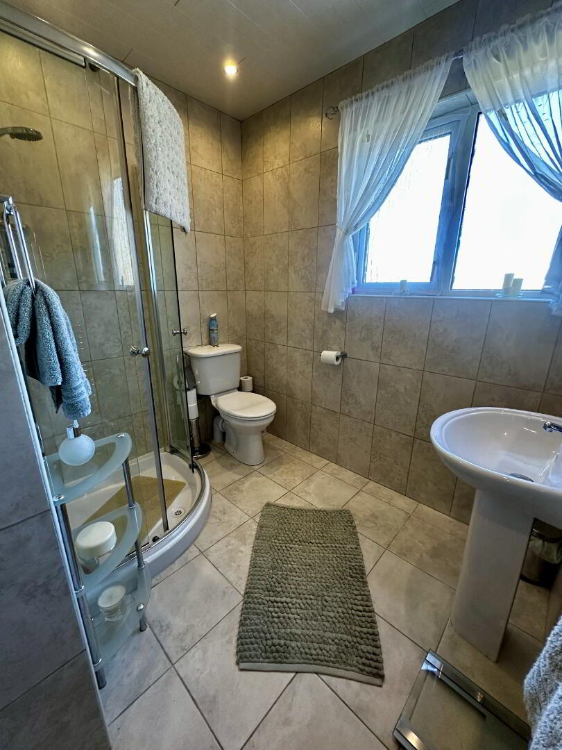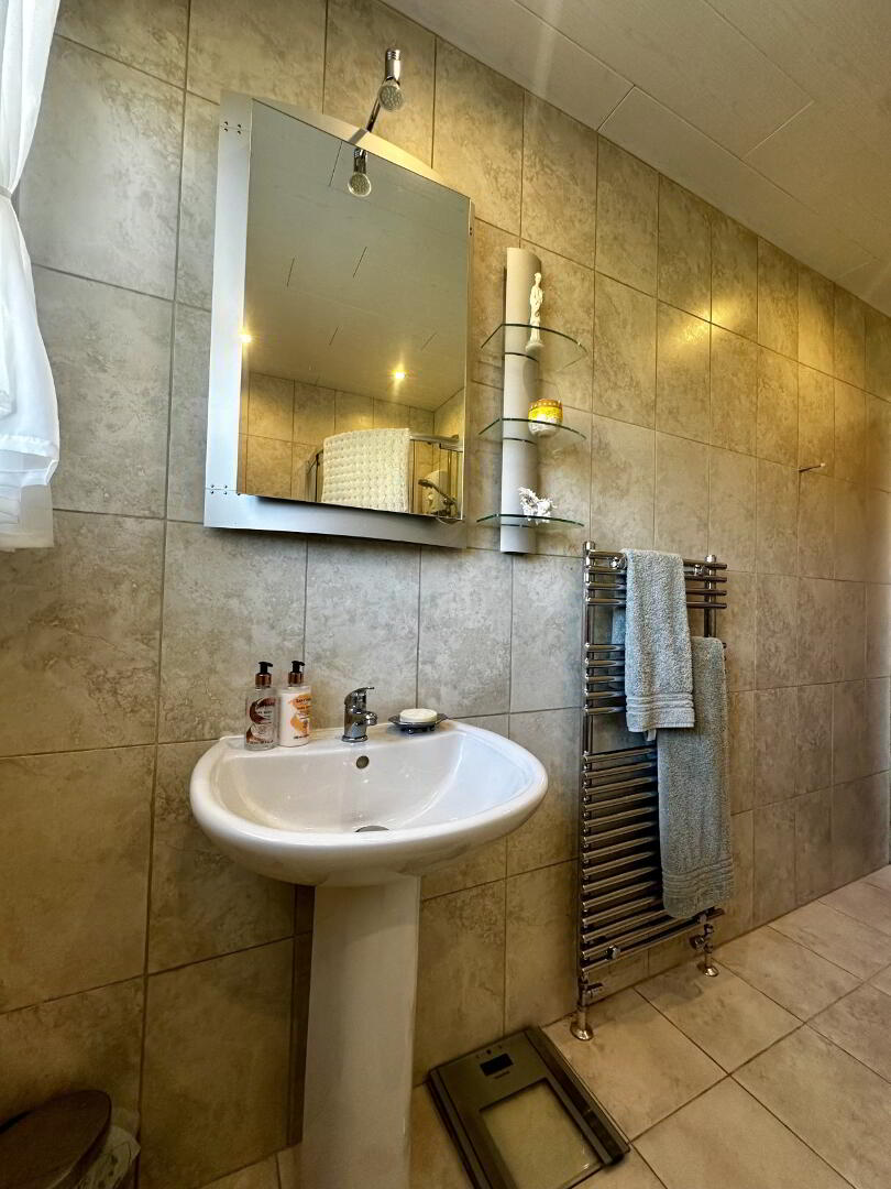 A fully tiled bathroom, complete with a corner walk-in shower, WC, wash hand basin, and a wall-mounted towel radiator.