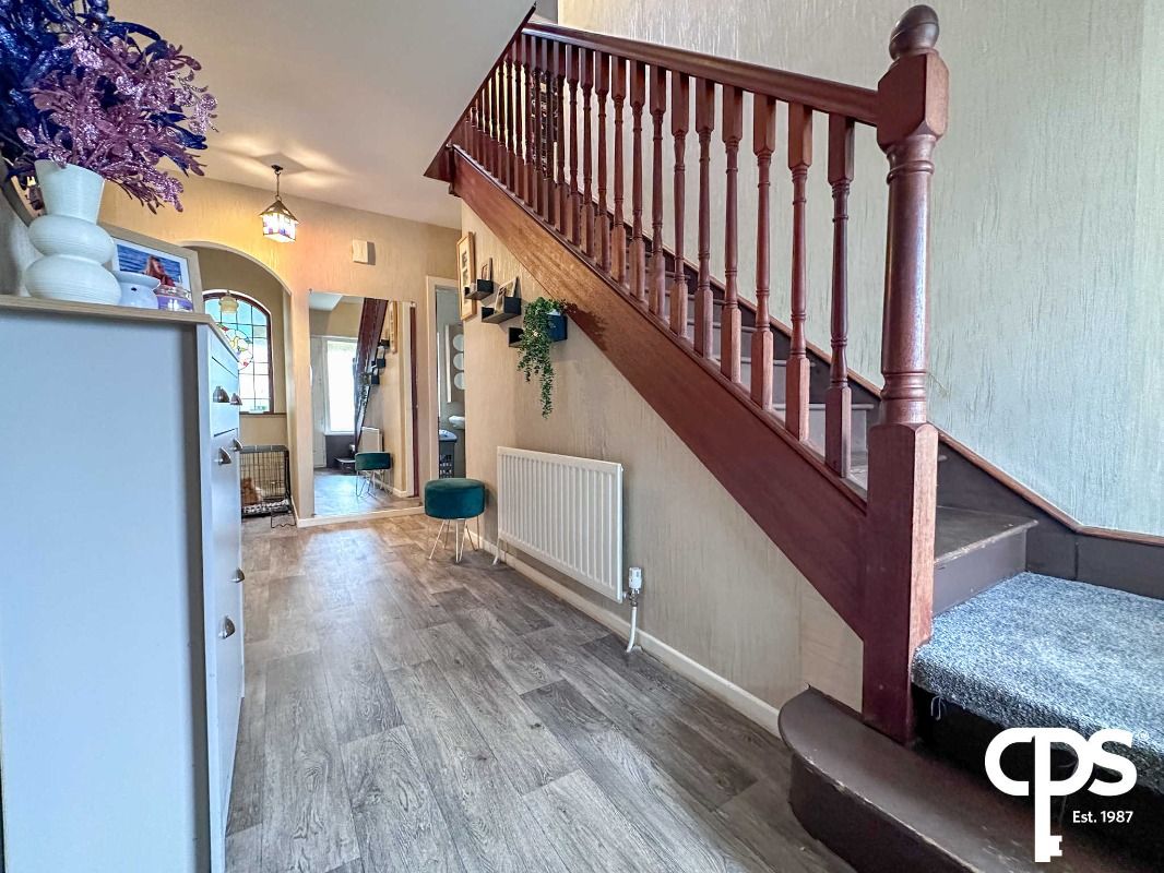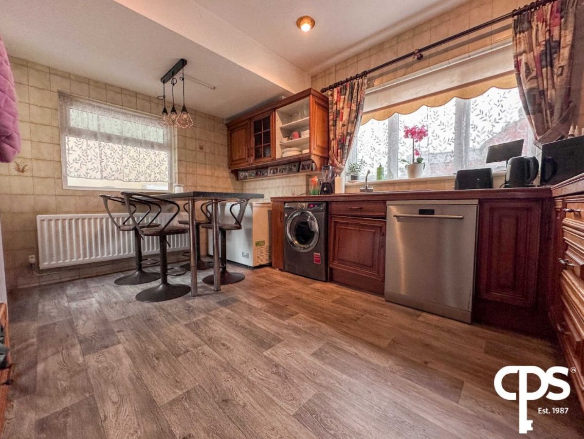 The spacious kitchen comes with wooden effect flooring throughout and benefits from being fitted with a number of high and low storage units, stainless steel and wash area, induction hob with extractor fan overhead and has plumbing installed for a washing machine and dishwasher. Not only does the kitchen presents ample space for table and chairs but also offers access to the rear of the property through the side patio door.
