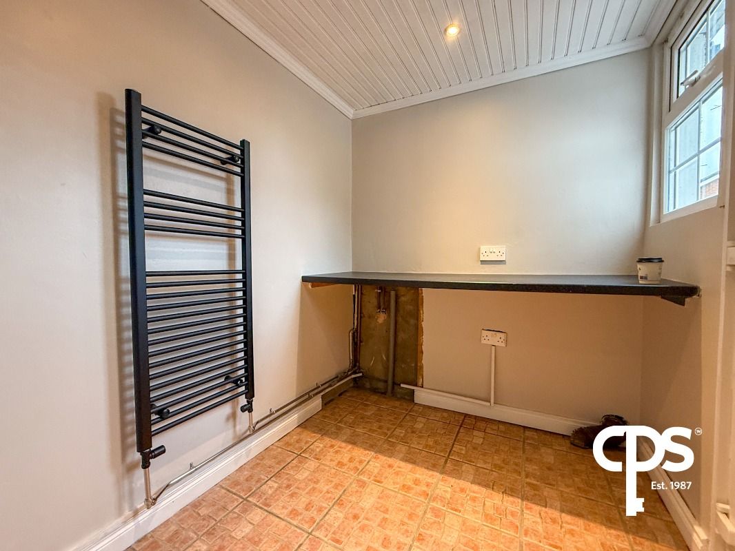 Practical utility room with tiled flooring, offering space for a washing machine and tumble dryer. The room benefits from a wall-mounted radiator.