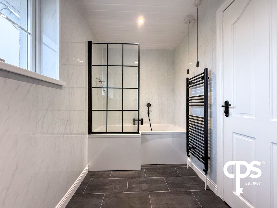 Recently fitted family bathroom comprising a shower bath, shower panels to walls, vanity unit with wash hand basin, WC, laminate flooring, and a wall-mounted radiator.