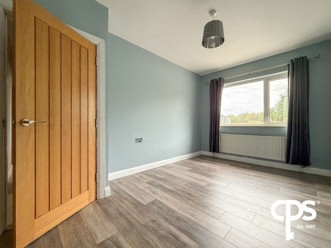 Front-facing double bedroom with laminate wooden flooring, radiator, and space for wardrobes.