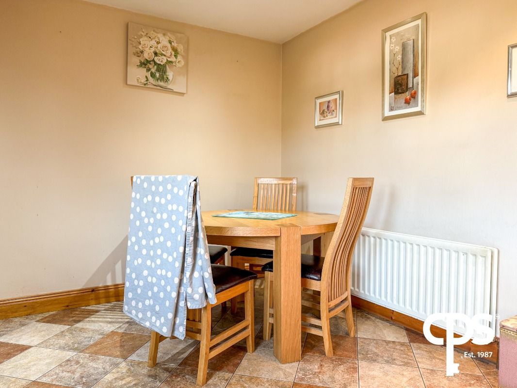 Tiled flooring, high- and low-level units, stainless steel sink, cooker, and ample space for dining. Double radiator.