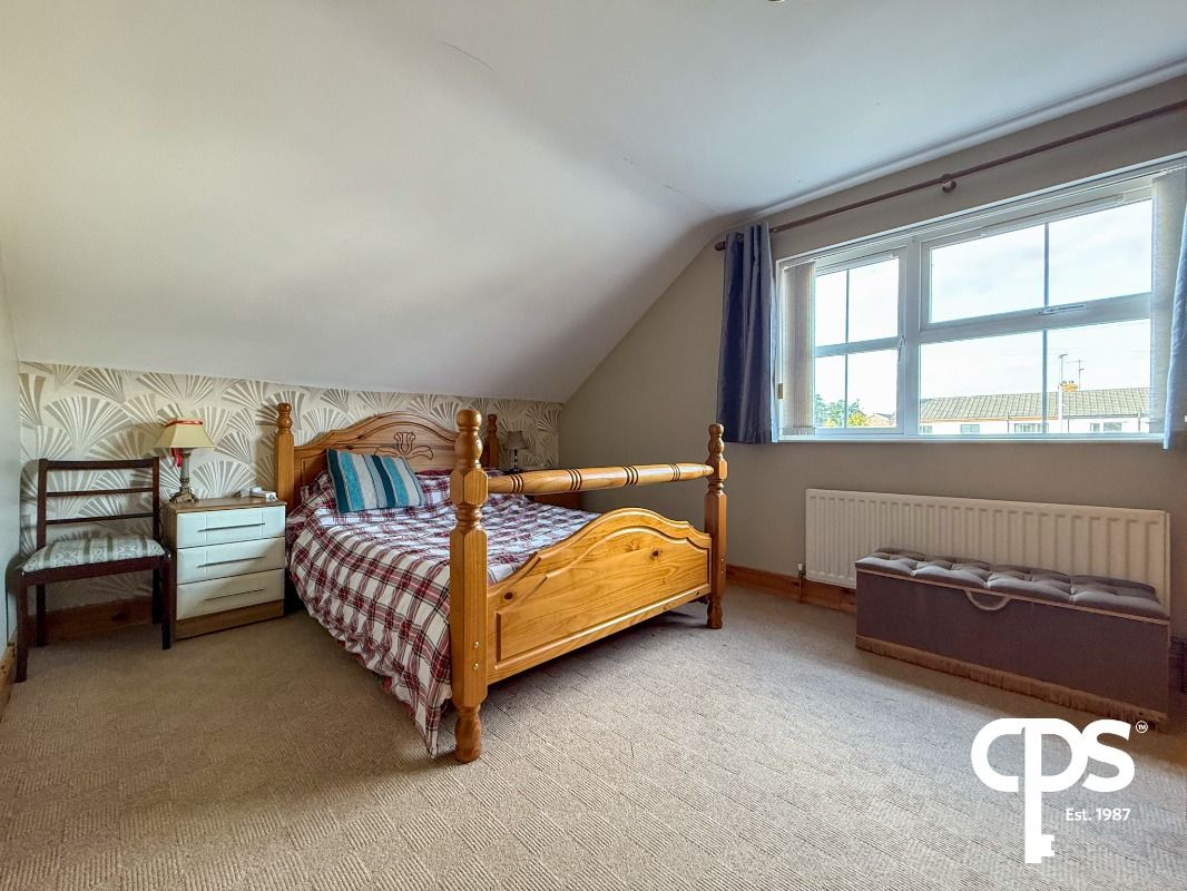 Rear-facing double bedroom with carpet flooring and double radiator.