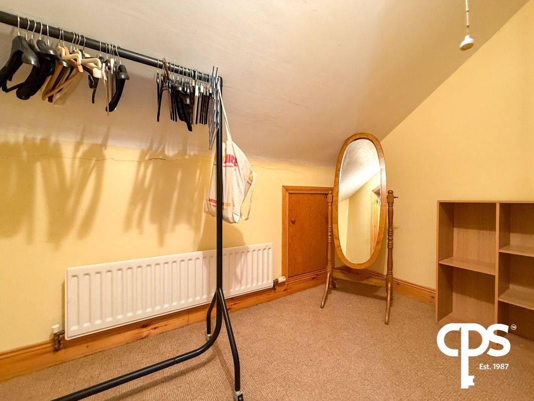 Spacious bedroom with laminate flooring, walk-in area, and double radiator.