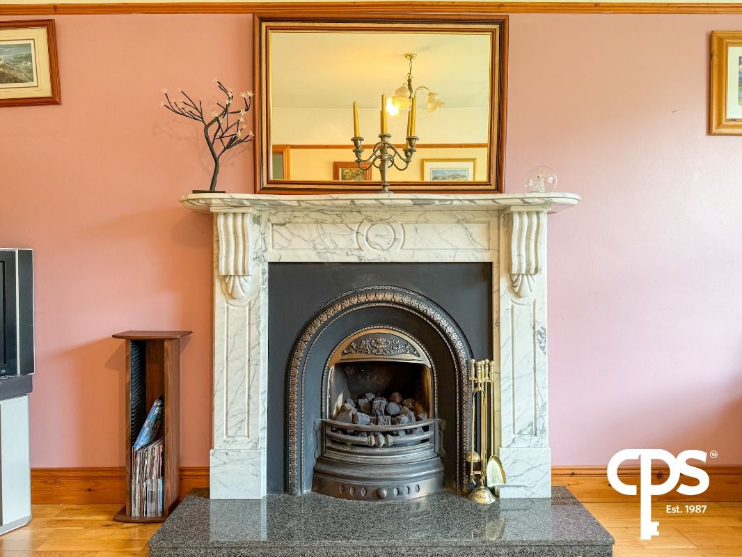 A spacious, front-facing reception with solid wood flooring, feature gas fire, and double radiator.