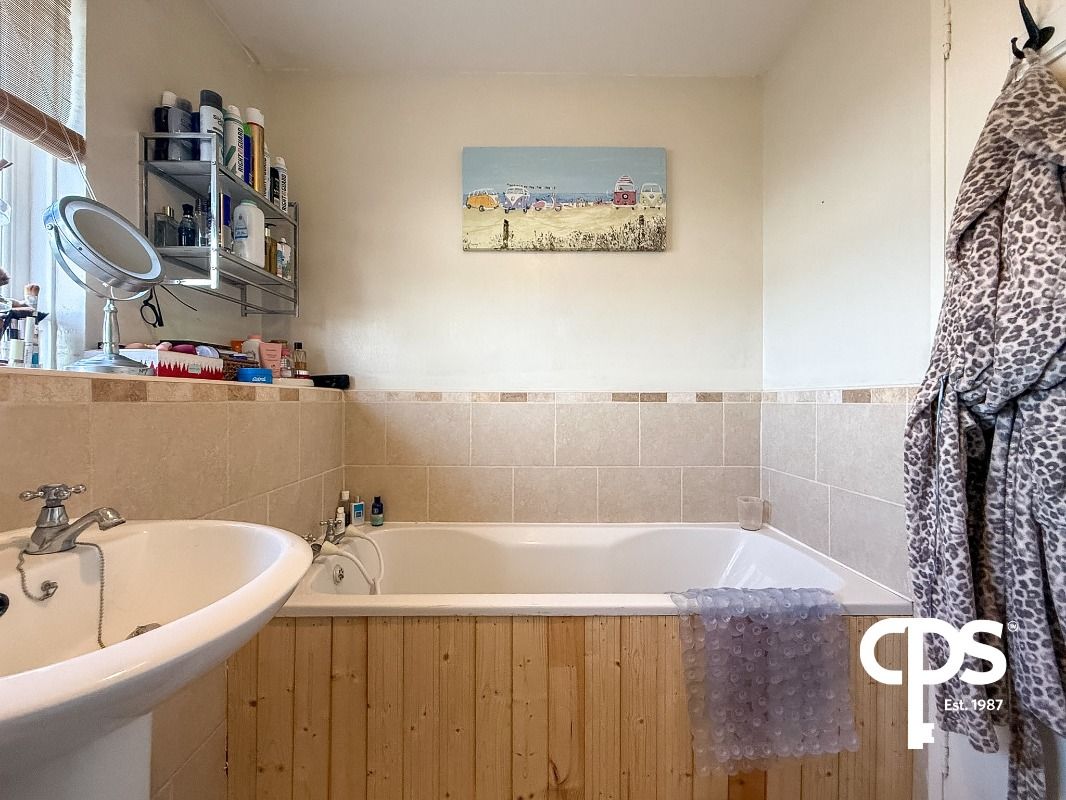 Located upstairs and fitted with bath, WC and wash hand basin. Tiled flooring with tiled walls behind the bath area.
