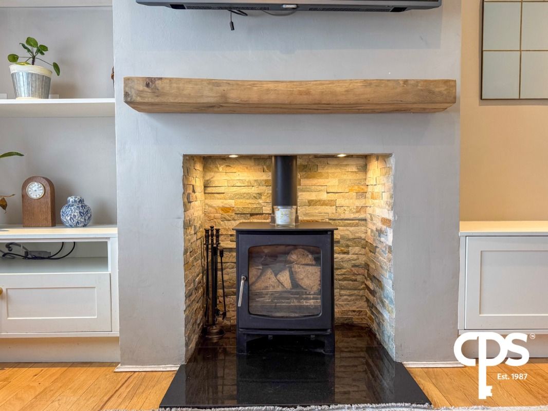 A bright and welcoming main reception room featuring stylish wooden laminate flooring and a charming multi-fuel stove set on a granite hearth, creating a warm and cosy focal point.