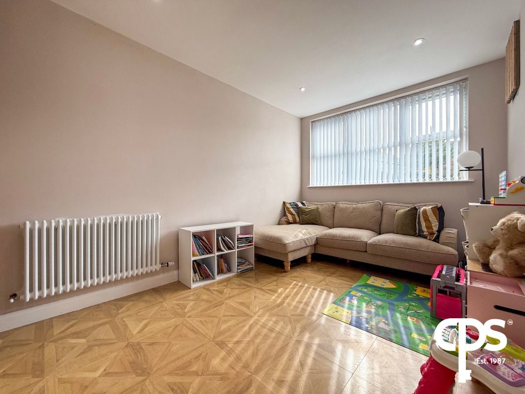 Located to the rear, this spacious room features laminated wooden flooring, a suspended TV bracket with sockets, and a radiator—ideal as a second lounge or entertainment space.