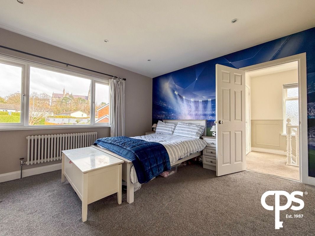 A spacious double bedroom featuring carpeted flooring, a stylish panelled feature wall, and integrated sliding wardrobes. Includes radiator and TV wall mounting point.