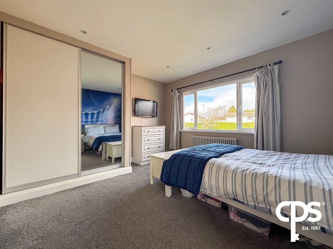 Another generously sized double bedroom with front-facing views, carpeted flooring, integrated wardrobe, and TV bracket.