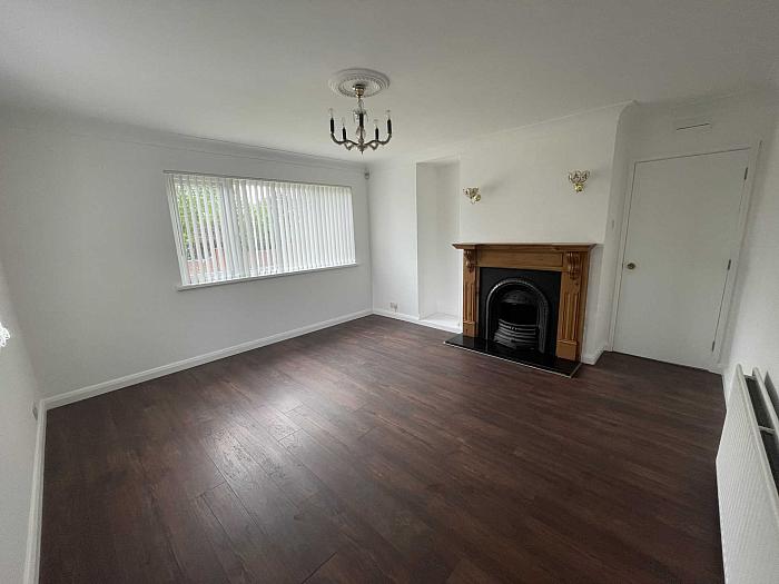 Open fire with wooden surround and marble hearth, coving and centre piece, walnut effect laminated floor.