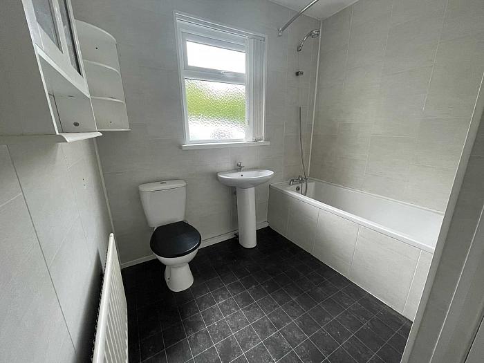 White bathroom suite, low flush WC, pedestal wash hand basin panel bath with mixer taps over, tile effect pvc wall panelling, lino floor.