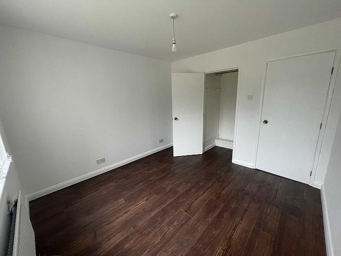 Front aspect, walnut effect laminated wooden floor, walk in wardrobe.