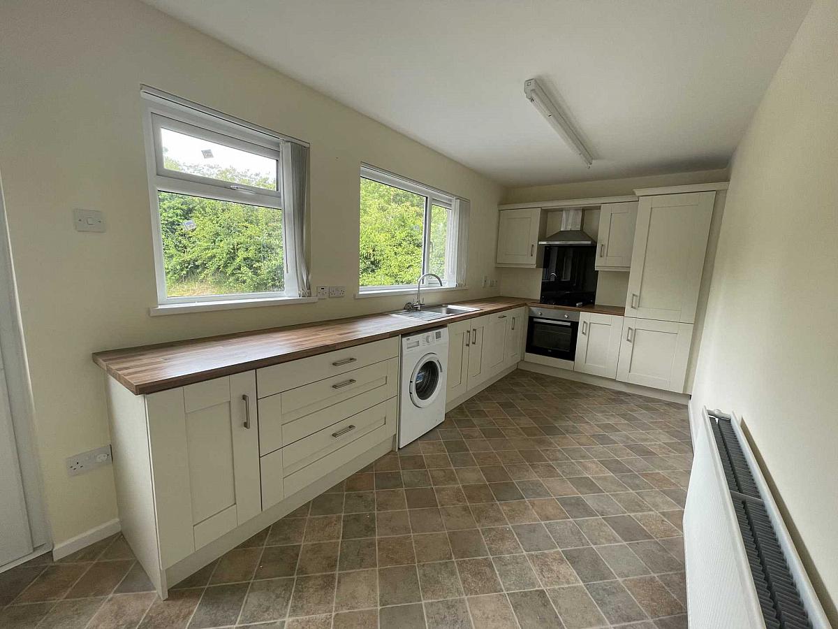 High and low level cream shaker style units with wooden effect counter tops, intergrated fridge/freezer, dishwasher, electric oven with hob and extractor fan over, stainless steel sink and drainer, plumbed for washing machine.