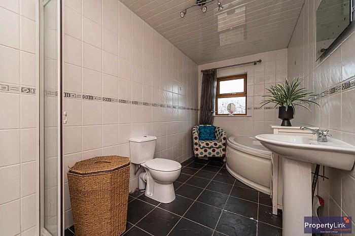 Family bathroom suite comprising of corner bath, corner shower enclosure with electric shower, pedestal wash hand basin and low flush WC. Fully tiled floor and walls.