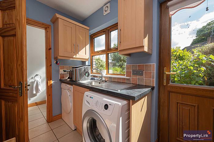 Utility space including fitted units, with stainless steel sink and drainer, plumbed for washing machine, space for tumble dryer, tiled floor, with rear door leading to back patio area.