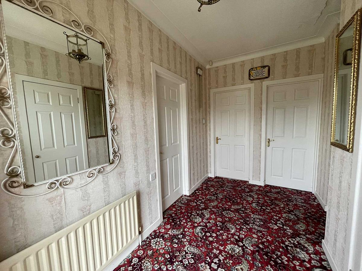 Entered via a PVC door with glass inset and side panels, access to all areas of the house, carpet floor covering and hotpress.