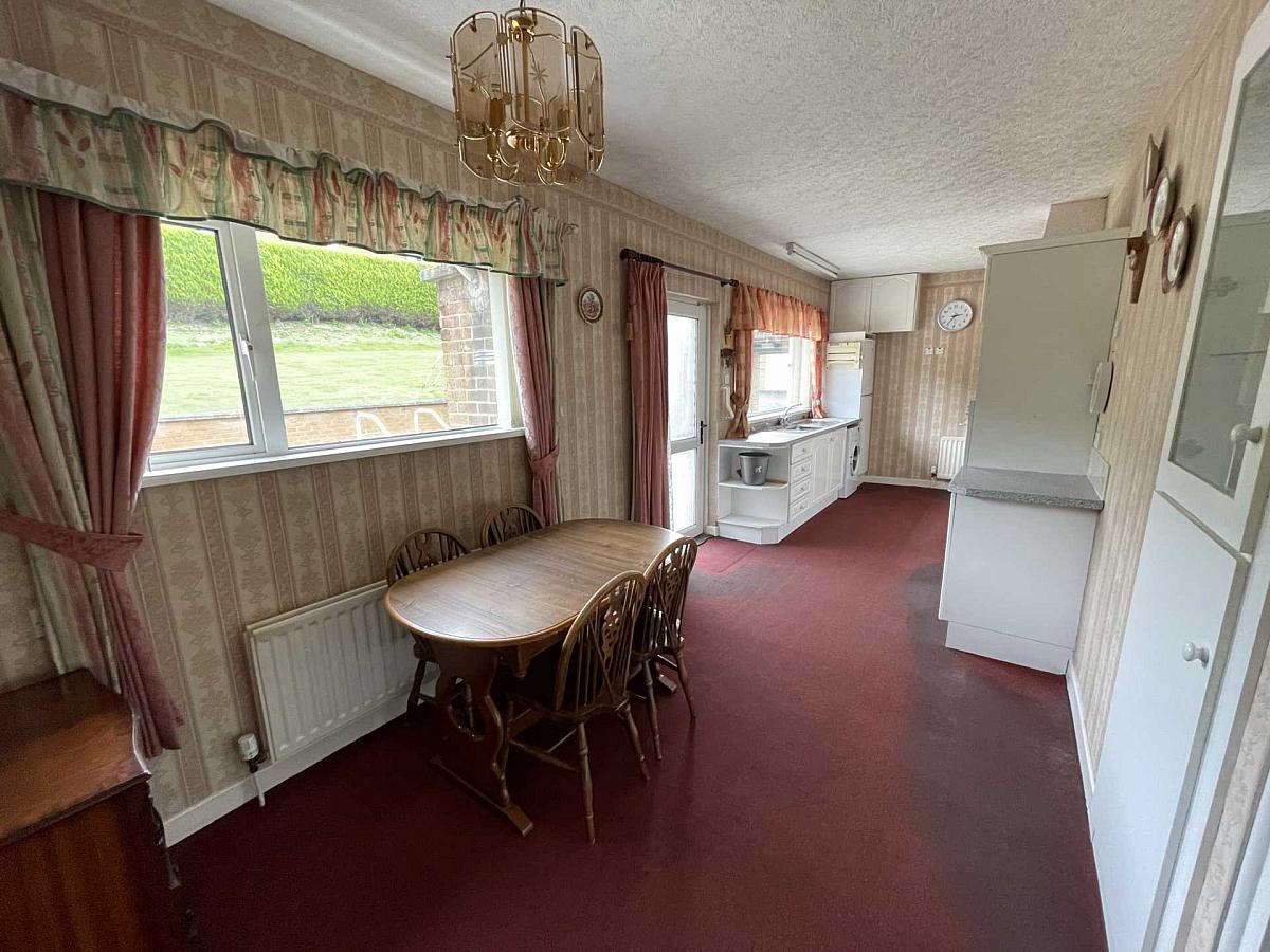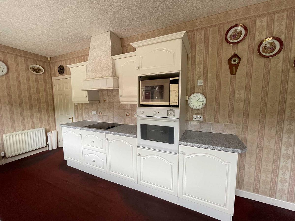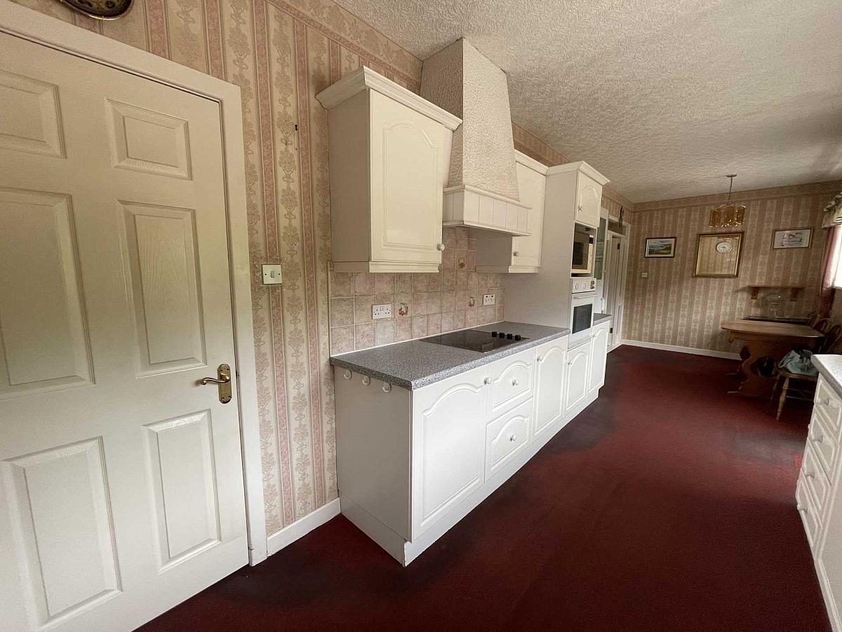 Generous kitchen dining area comprising of high and low level white fitted units, high level electric oven, electric hob with extractor fan over, space for micro wave, fridge freezer and auto washer, stainless steel sink and drainer board with ample room to house dining table.