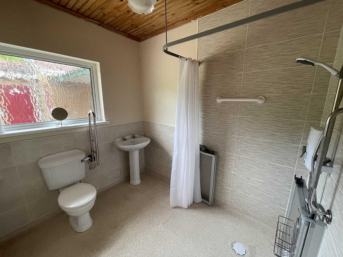 Newly fitted wet room with part tiled walls, walk in electric shower, pedestal wash hand basin and low flush WC.