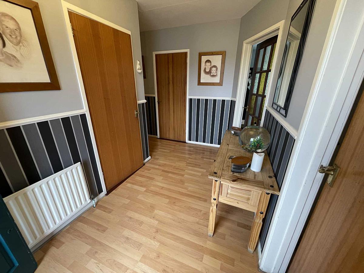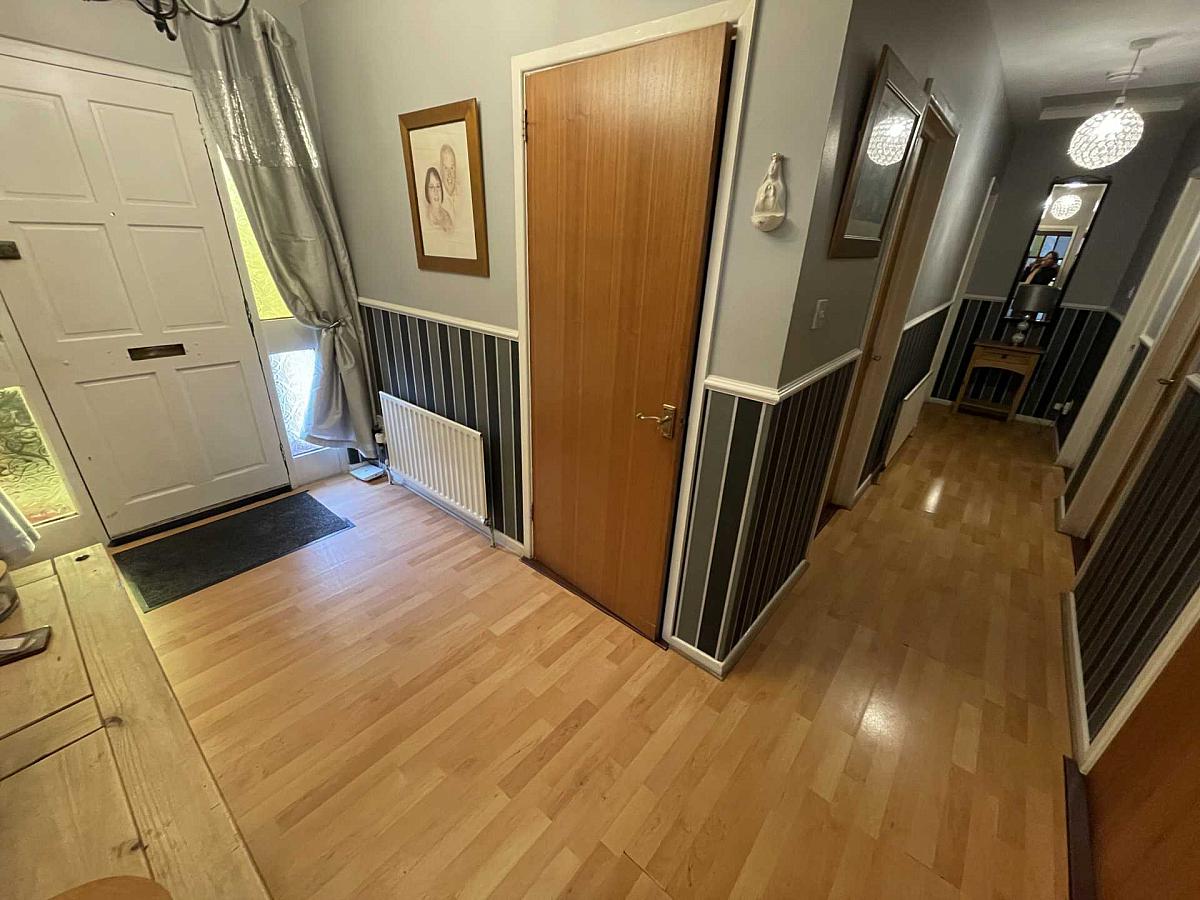 Entered via a wooden front door with glass side panels to spacious hallway, with laminate wooden floor and cloakroom storage.