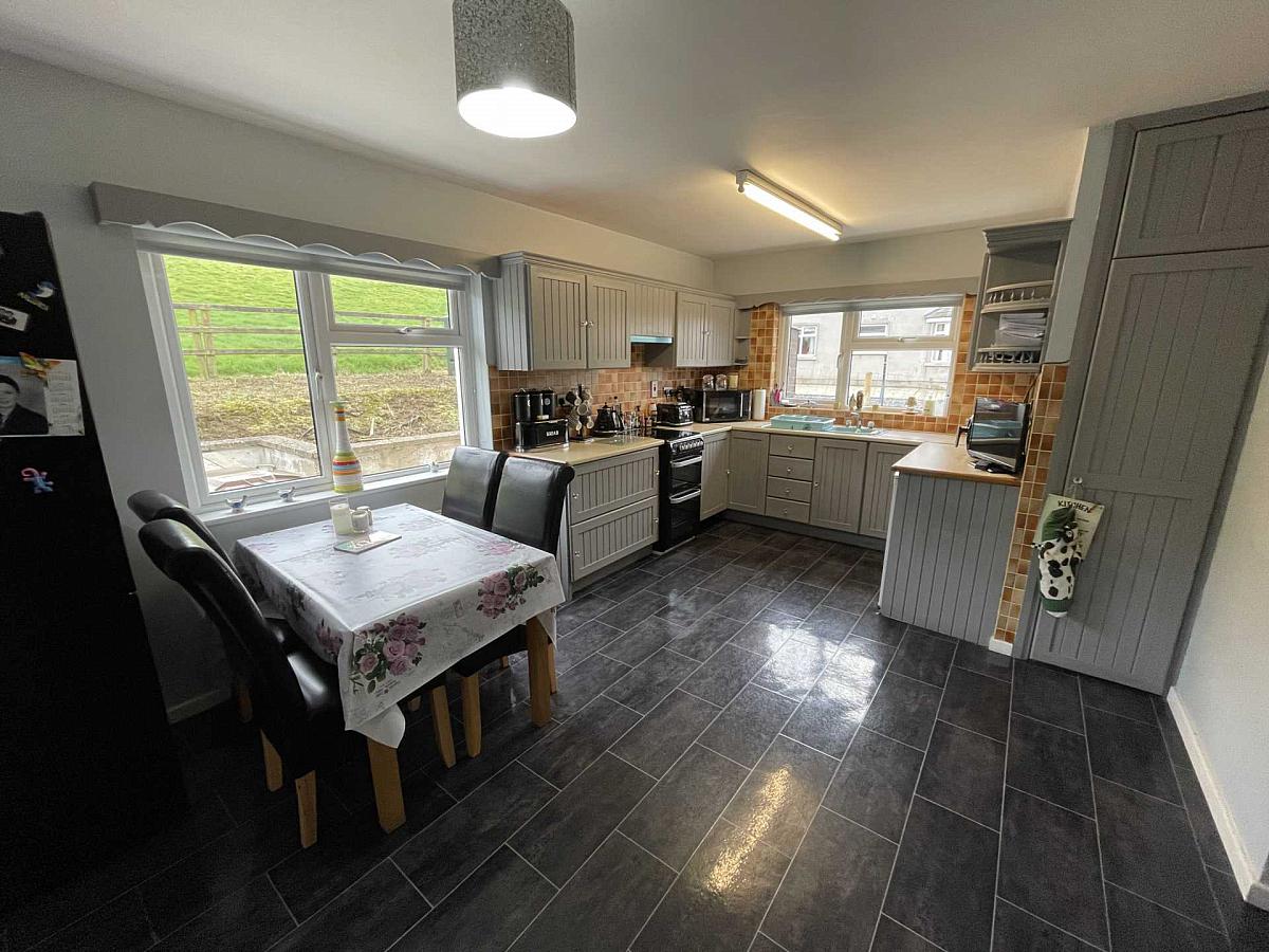 Spacious kitchen with high and low level grey painted units to include, stainless steel sink and drainer, space for cooker and fridge, part tiled walls, lino floor covering, free standing dresser with ample space to house dining table.