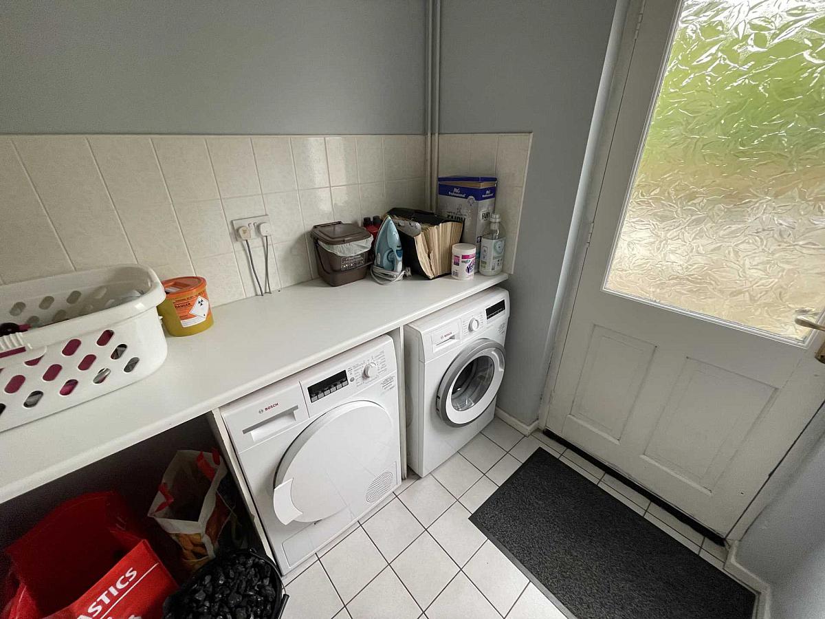 Accessed via kitchen with tiled floor and part tiled walls with bench space and space to house auto-washers