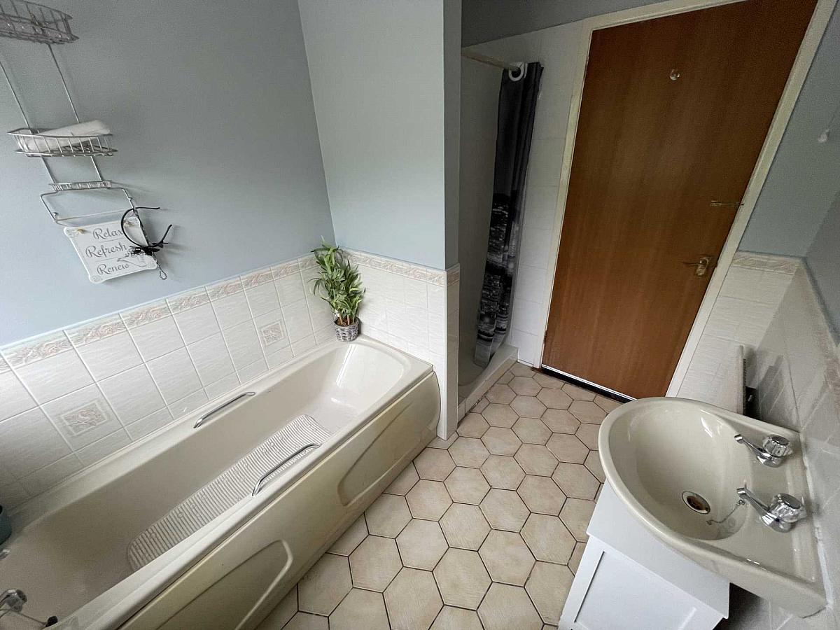 Four piece bathroom suite to include pedestal wash hand basin, low flush WC, panel bath, shower enclosure, ceramic tiled floor and part tiled walls.