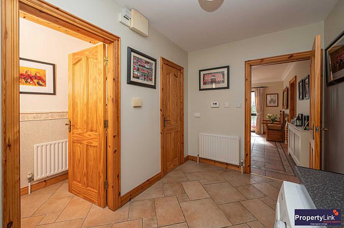 An inviting entrance hallway finished with ceramic floor tiling trimmed with a decorative boarder. A solid pine staircase with understairs storage and leading to the second floor. Easy access to all rooms on the ground floor. Finished with ceiling coving and centre piece to complete this beautiful entrance hallway.