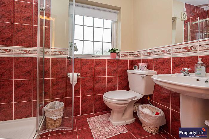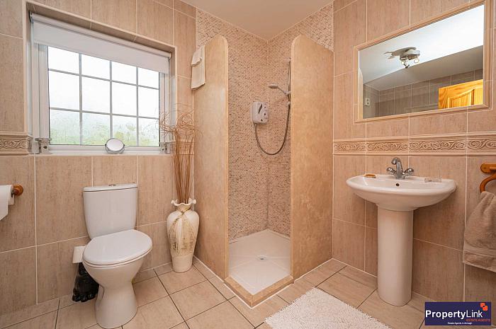 A bespoke family bathroom suite comprising of walk-in shower, jacuzzi bath, two flush WC and pedestal wash hand basin. Ceramic wall and floor tiling.