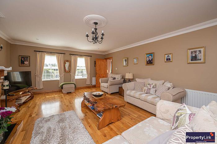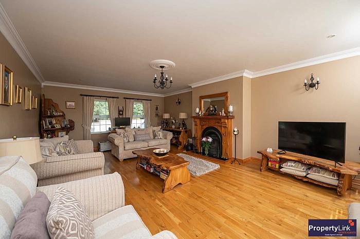 An extensive sitting room with dual aspect window views. This lounge is the perfect space for the extended family and ideal for entertaining. Finished with a solid wooden floor, feature fire surround with open fire, ceiling coving and centre piece.