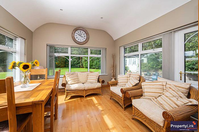 A bright sun-room finished with solid wooden flooring recessed spot lights and uPVC door leading out to the rear garden and patio area. Added features include the high curved ceiling and french pine doors with decorative glass panels.