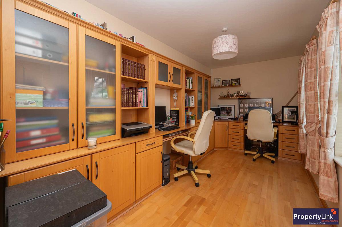 Currently used as an office with fitted furniture to include storage, bookcase shelving and two desk spaces for chairs under. Frontal aspect window views finished with laminate wooden flooring. Furniture could easily be removed if desired as a forth bedroom.
