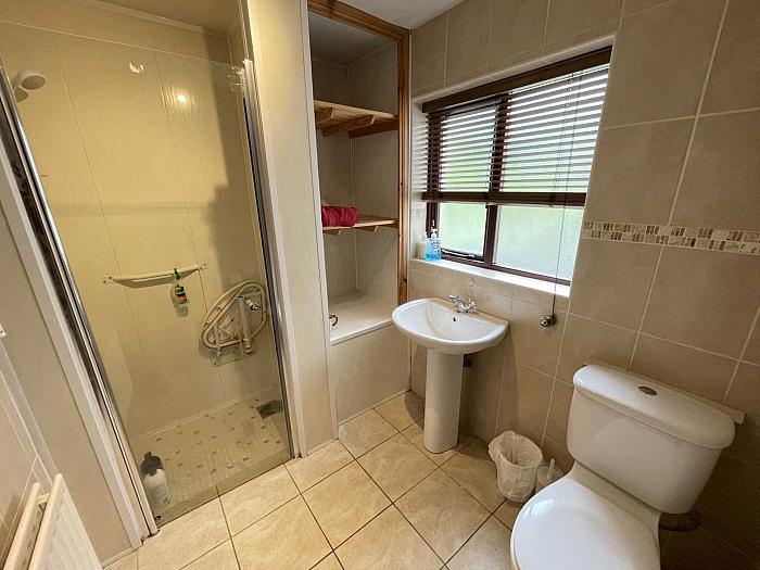 Located on the ground floor, low flush WC, pedestal wash hand basin, electric shower, ceramic tiled floor.