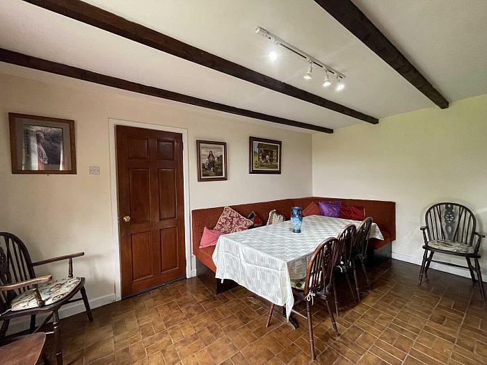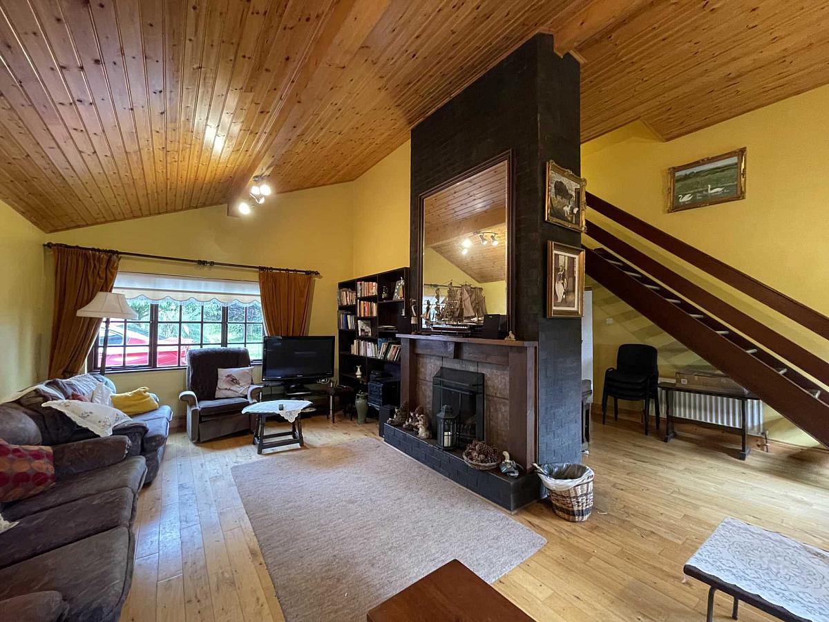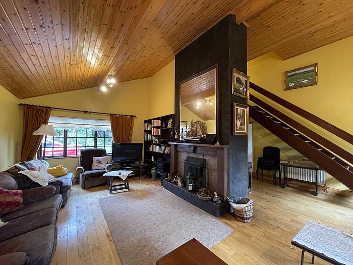 Spacious rear aspect room offering solid wooden floor, vaulted ceiling, open fire and stairs leading to the second floor.