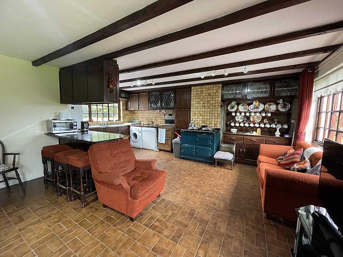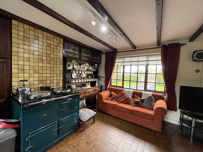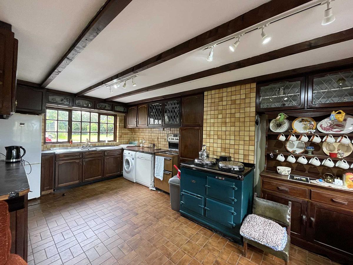 A vast kitchen/dining area with dual aspect window views, ceramic tiled floor, fitted units and Aga Stove. An excellent space for a remodel kitchen dining and living space.