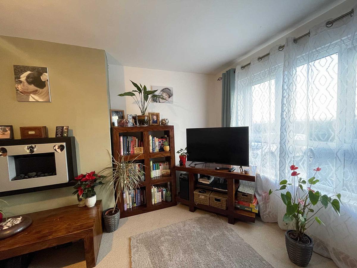 Spacious room offering frontal aspect window views with electric fire and carpet floor covering.